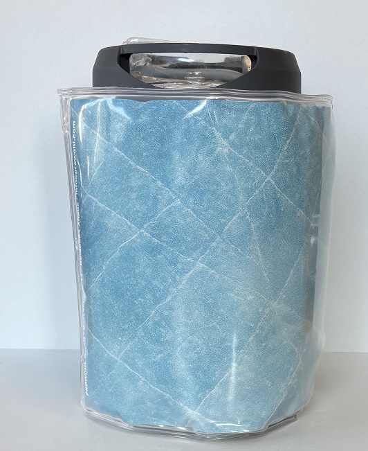 Hülle aus PVC-freier Folie mit eingeschweißtem Isolierschaum und einem farbigen Einleger, befüllt mit Kühlgel (flexibel bis -18 °C),passend für handelsübliche 5 l Fässchen,